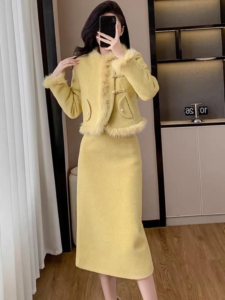 وصف المنتج :الوصف : طقم تيور قطعتين صوف شتوي الجاكيت مزين بالفرو وقصة التنورة ماسكة على الجسماللون الليمونيفيديو توضيحي :