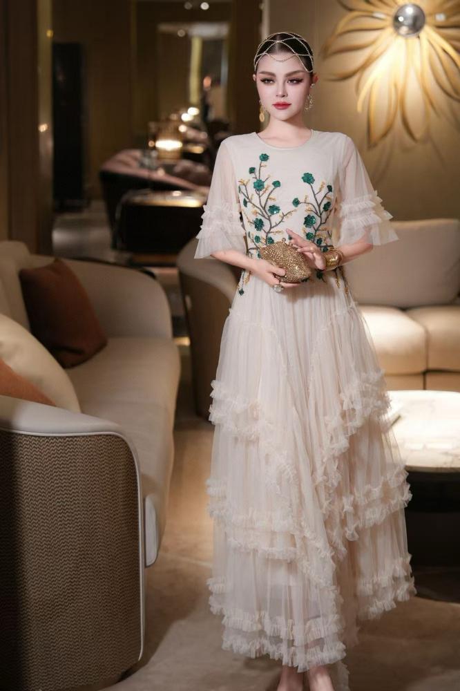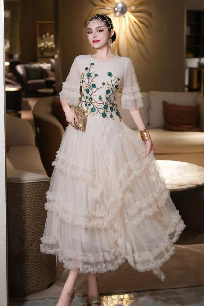 وصف المنتج :النوع : فستان فخم سهرة الوصف : فستان السهره الفخمخامه التل تطريز على الصدر مكس الالوان ومن تحت تل طبقات منفووش اللون البيج .فيديو توضيحي :