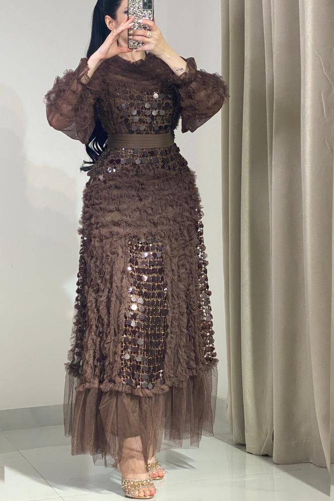 وصف المنتج :الوصف :فستان طويل سهرة فخم ترتر بالتل المنفوش اللون ترندي مع الكشكشة بالأكمام ومن تحت اللون البني (الموكا) . تجهيزها من 10-15 يومفيديو توضيحي :