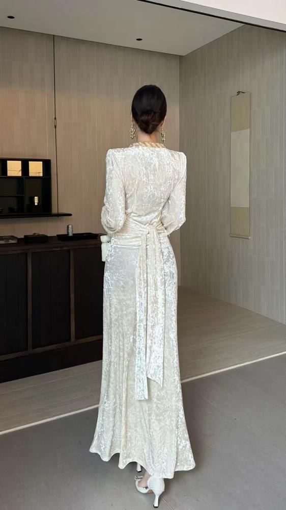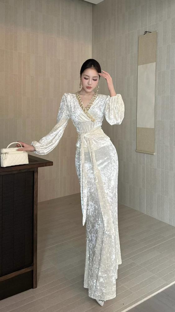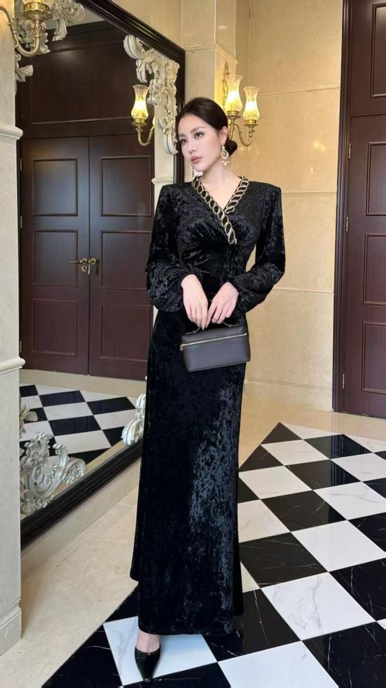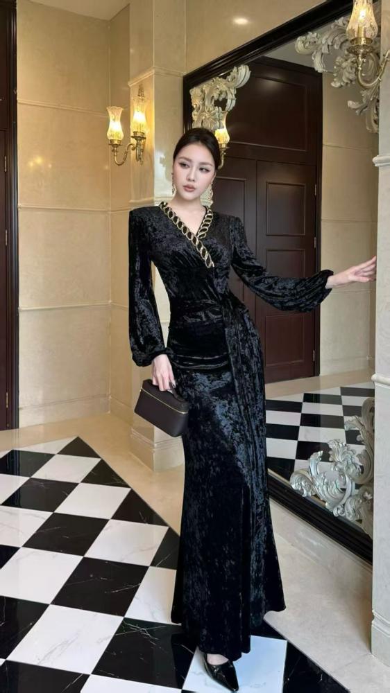 وصف المنتج :الوصف : فستان طويل مخمل للمناسبات قصة ماسكة تحلي وترسم الجسم مع ربطة على الخصر من نفس الخامه كلفة قيطان ذهبي مطرز على الصدرالبيجالاسودفيديو توضيحي :