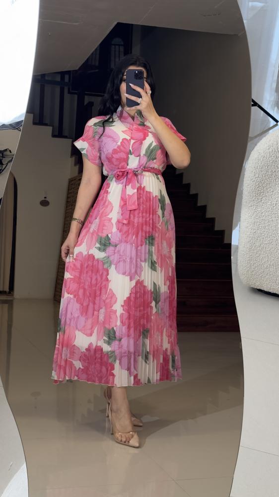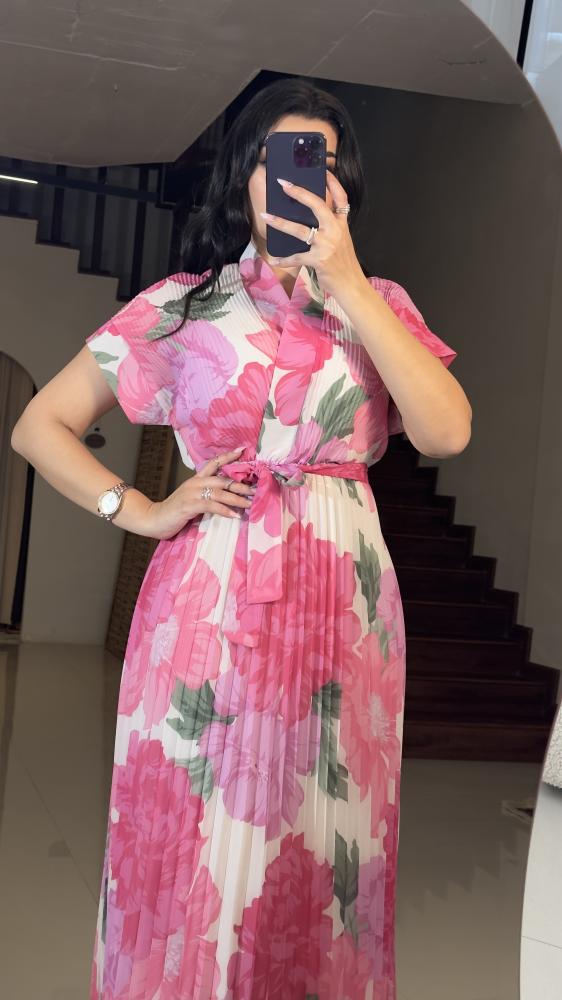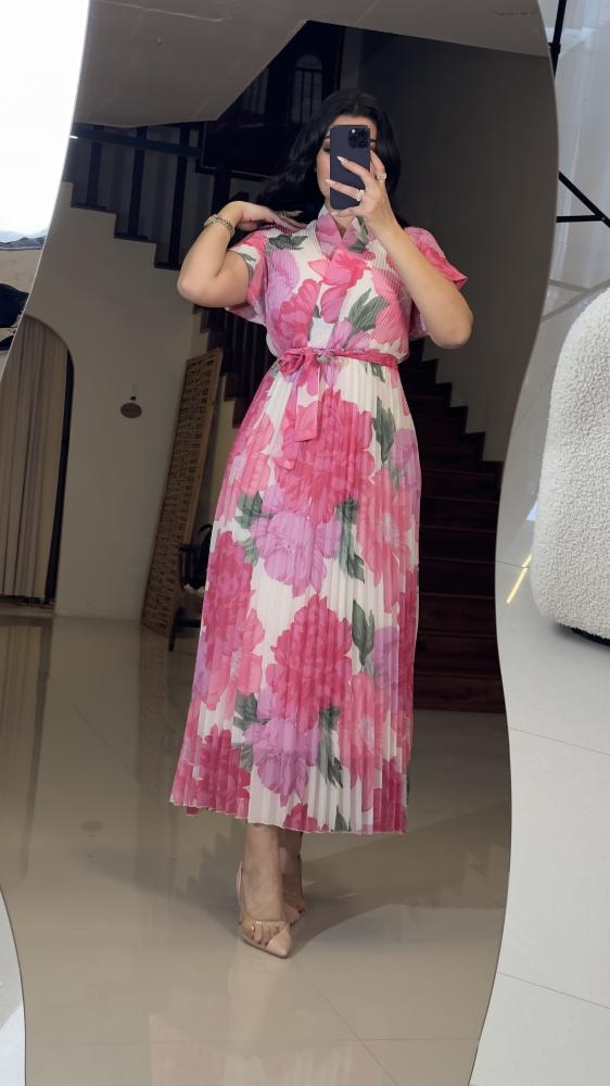 وصف المنتج :النوع : فستان مورد .الخامة : كريب ساتان .الوصف : فستان مورد ربيعي بقصات بلاسيه وحزام من نفس الخامة اللون الفوشي .فيديو توضيحي :