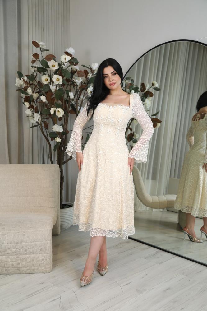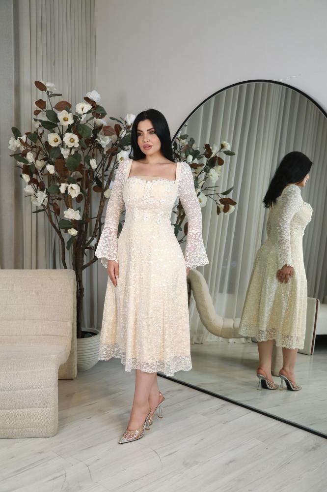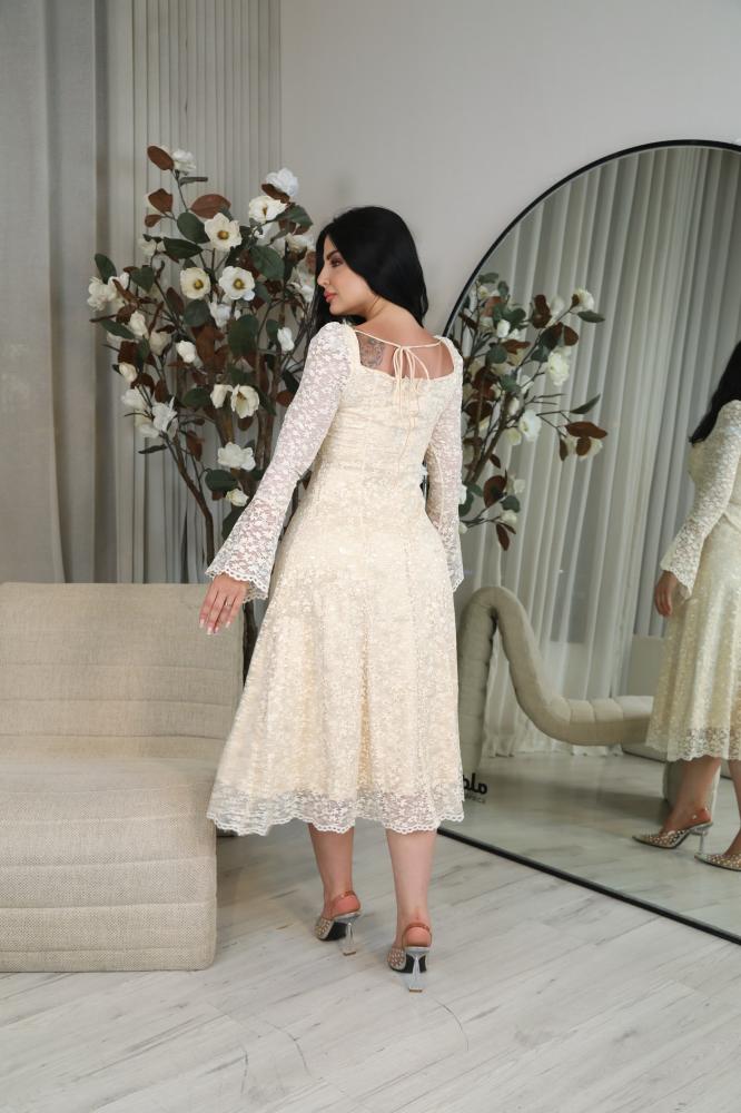 الوصف : فستان ميدي انيق للمناسبات دانتيل مورد اللون البيج .