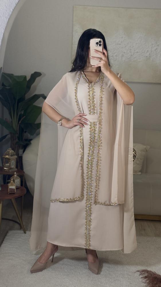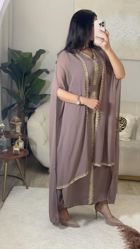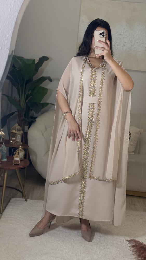 وصف المنتج :النوع : جلابيه قصه واسعه .الخامة : كريب حرير .الوصف : جلابية نسائية فخمه قطعتين مزينة بالتطريز الذهبي .فيديو توضيحي :