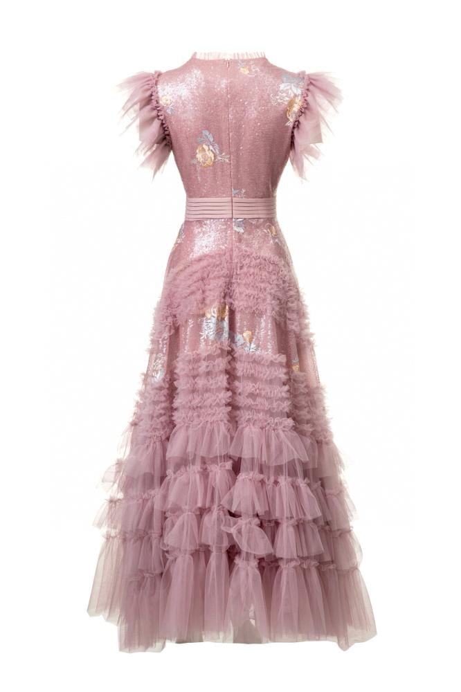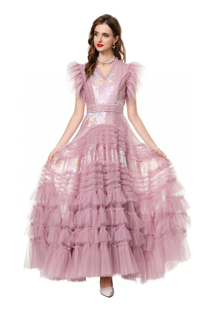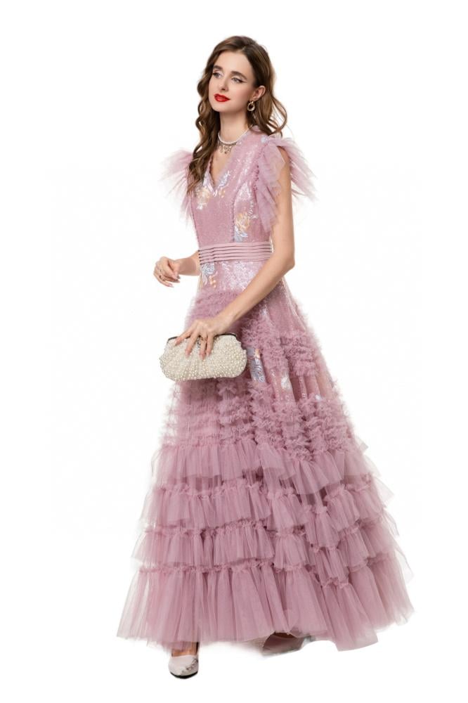 • الوصف : فستان طويل سهرة فخم خامة ترتر بتورديدات صيفيه ومن تحت تل كشكش منفوش طبقات اللون الزهري .